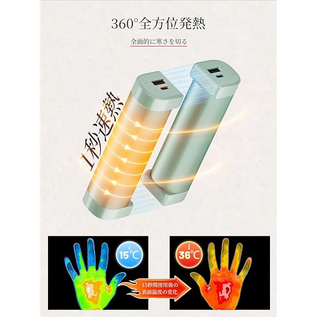 【1秒でポカポカ!360°全面発熱】充電するだけで、繰り返し使えるエコなカイロが新登場!寒さが厳しい日でも、スイッチを入れてたった1秒ですぐ温もりを実感。手先の冷えが気になる時も、サッと取り出して即効暖まろう。 360°全面発熱設計で、どこを持ってもまんべんなく温かく。握り方や置き場所を選ばず、じんわり持続的なあたたかさが続きます。 繰り返し充電可能なので、使い捨てカイロよりも経済的&地球に優しい。高い保温性能で、アウトドアや通勤・通学、オフィスでも大活躍!