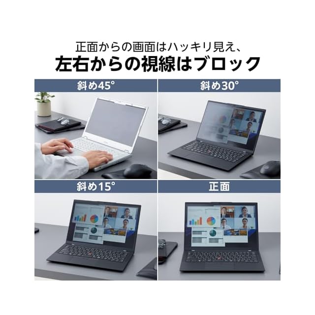 画面の正面を中心に60度(左右約30度)より外の角度からは画面がまっ黒に見えるので、パソコン画面を見られる心配がありません。