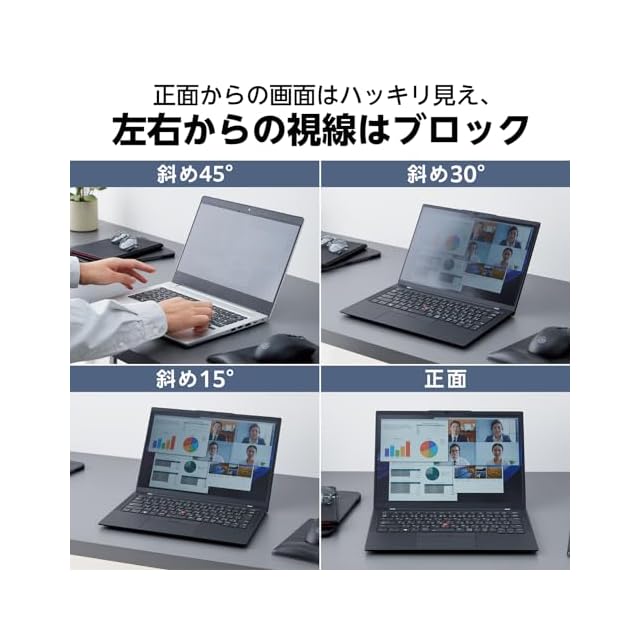 画面の正面を中心に60度(左右約30度)より外の角度からは画面がまっ黒に見えるので、パソコン画面を見られる心配がありません。