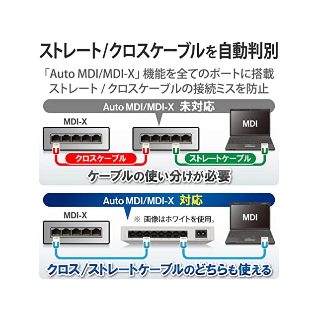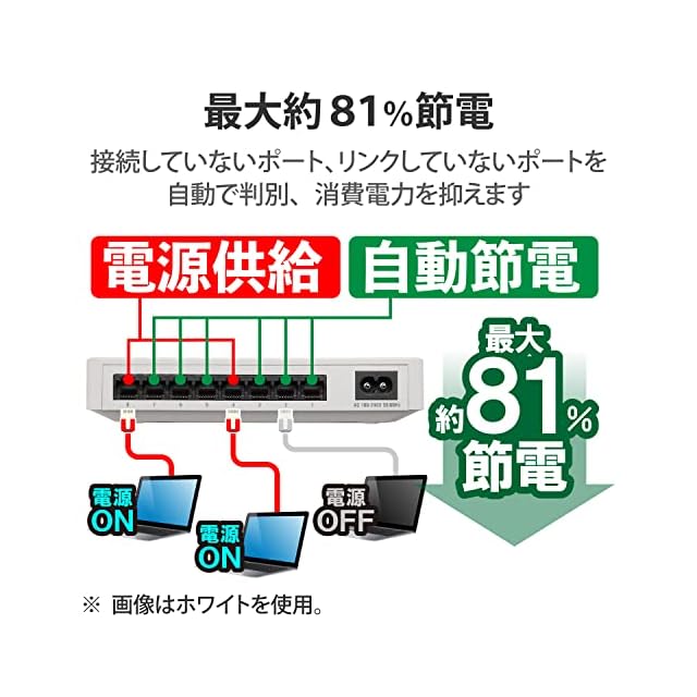 非通信時のポートへの電力供給をカットする省電力機能で、最大約81%節電※が可能な1000BASE-T対応の電源内蔵プラスチック筐体8ポートハブです。 ※計測は、負荷機からハブへデータを転送し、全ポート通信・非通信時の1分後の電力を計測比較した場合。