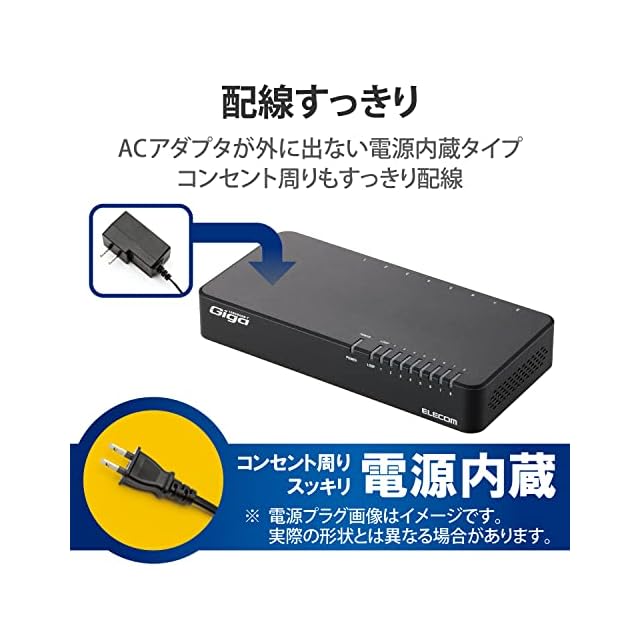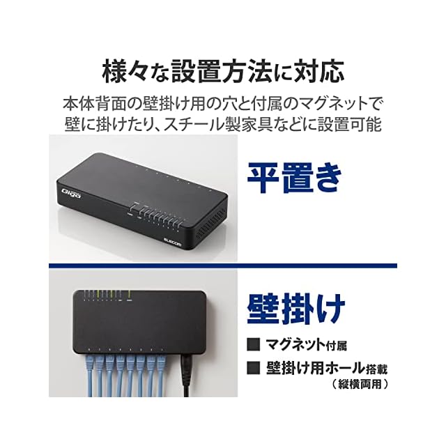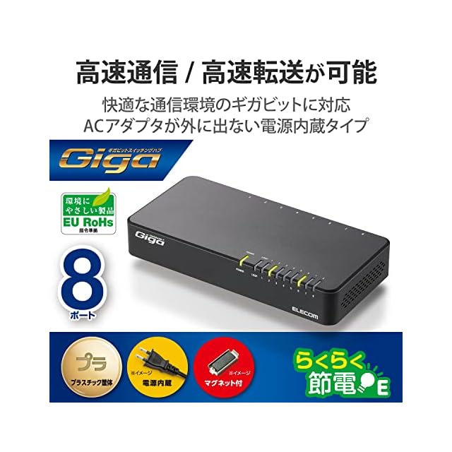 商品名:エレコム スイッチングハブ ギガビット対応 8ポート プラスチック マグネット付 電源内蔵モデル ブラック EHC-G08PN2-JB