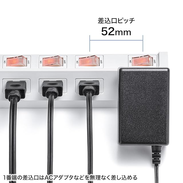 1番端にある差込口は間隔を52mm空けているため、ACアダプタなども無理なく差し込めます。