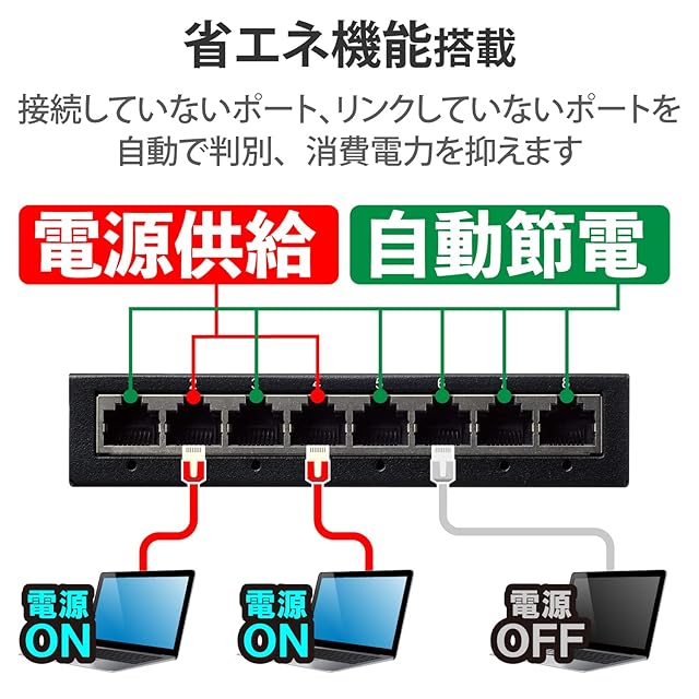 らくらく節電機能により接続していないポート、リンクしていないポートを自動的に判別し、電力供給を抑えます。パソコンがシャットダウンしている環境では、大幅な電力の節約を実現することができる、省エネ法に準拠したスイッチングハブです。