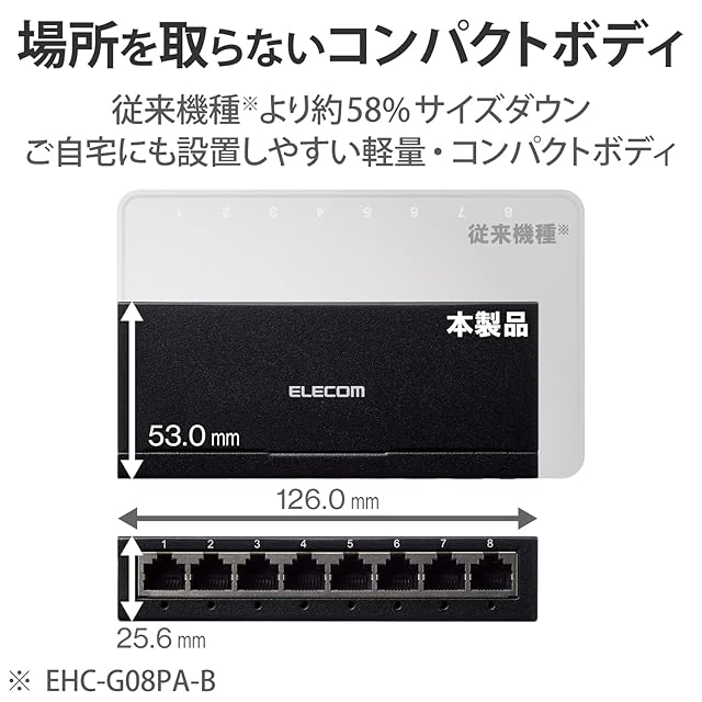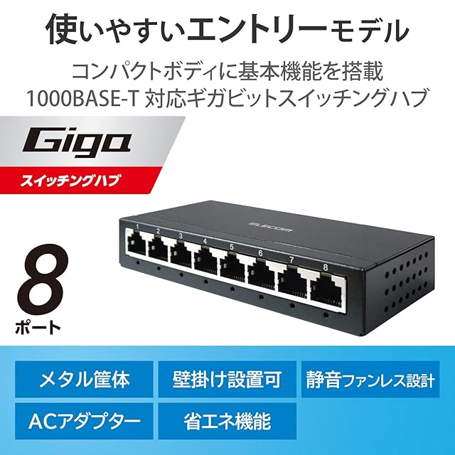 商品名:エレコム スイッチングハブ 8ポート ギガビット 金属筐体 コンパクト 軽量 [ACアダプター付属/壁掛け設置対応/静音ファンレス/省電力/EU RoHS指令準拠] ブラック EHC-G08MA-B