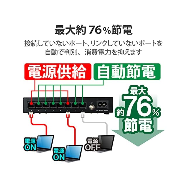 非通信時のポートへの電力供給をカットする省電力機能で、約76%節電※が可能な1000BASE-T対応の電源内蔵メタル筐体8ポートハブです。 ※計測は、負荷機からハブへデータを転送し、全ポート通信・非通信時の1分後の電力を計測比較した場合。