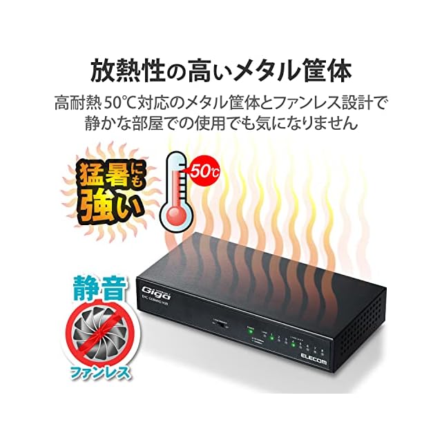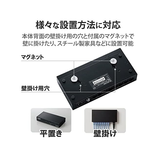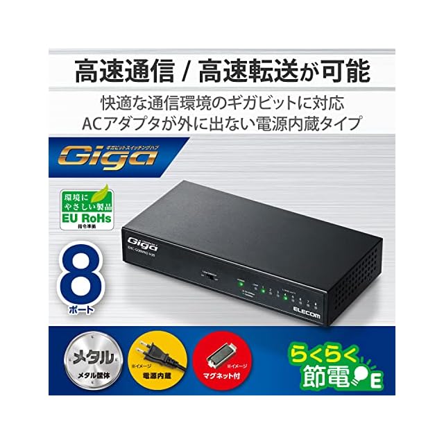 商品名:エレコム スイッチングハブ ギガビット 8ポート 金属筐体 マグネット付 電源内蔵 ブラック EHC-G08MN2-HJB