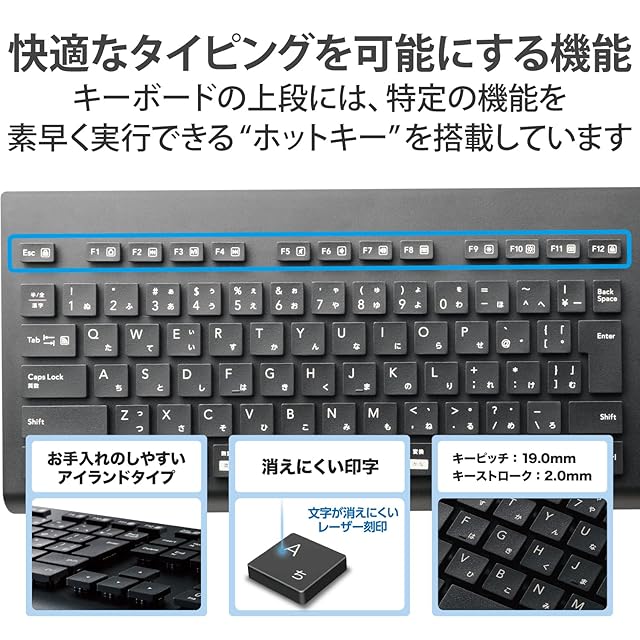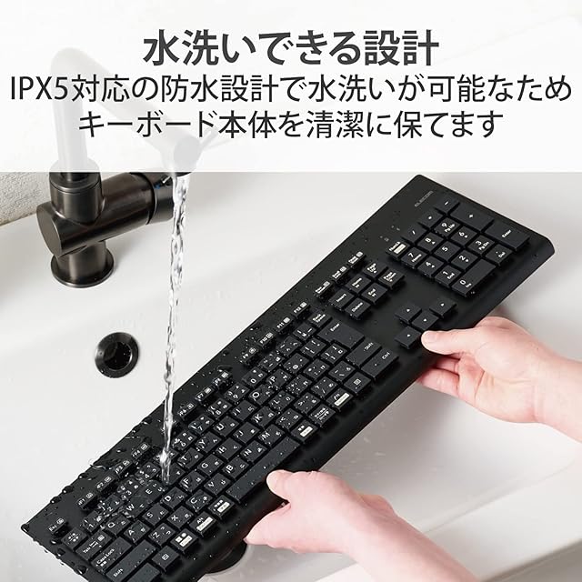 IPX5対応の防水設計で水洗いが可能なため、キーボード本体を清潔に保てます。