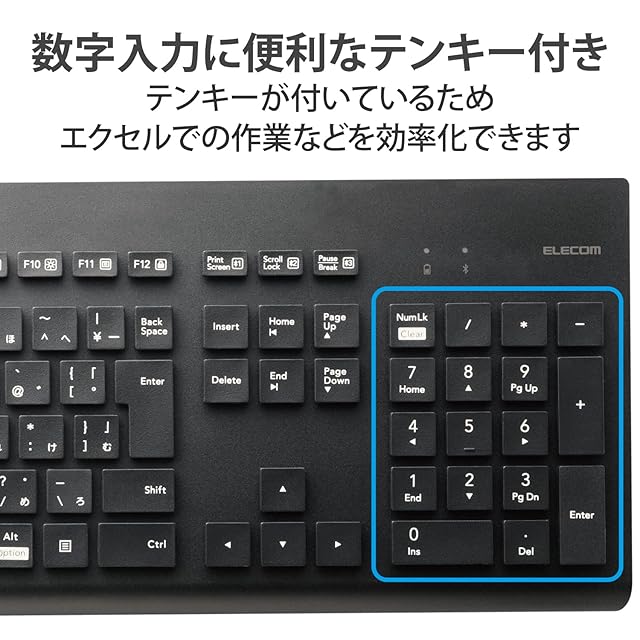 商品名:エレコム 洗える ワイヤレスキーボード Bluetooth 防水 IPX5対応 メンブレン フルサイズ テンキー付 抗菌 ブラック TK-WS03BMKBK