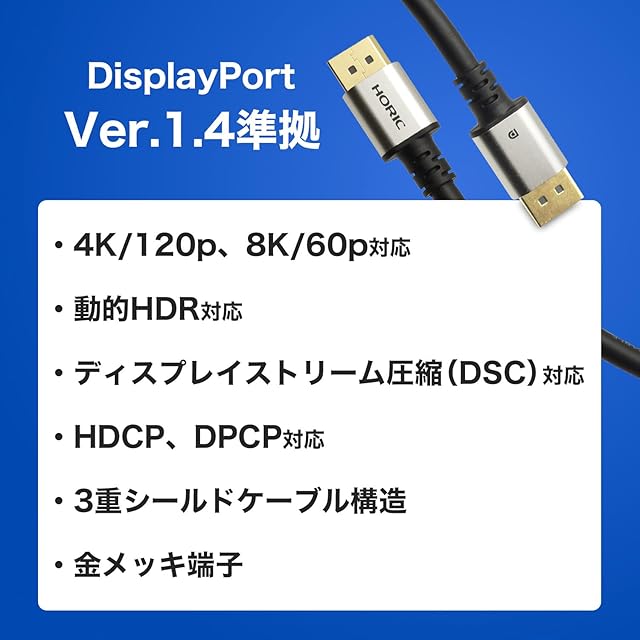 商品名:ホーリック DisplayPortケーブル 5m 32.4Gbps 8K/60Hz 4K/120Hz 1.4規格 DP50-049SB