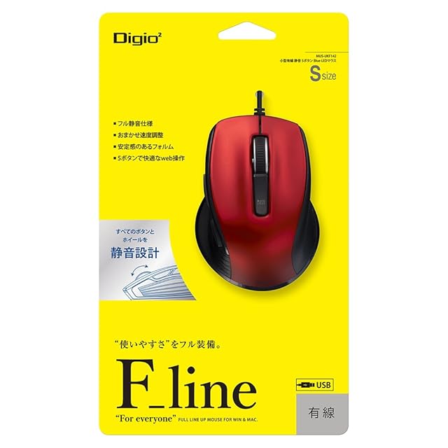 Digio2 F_line 5ボタンBlue LED マウス 小型 有線 静音 レッド 48397