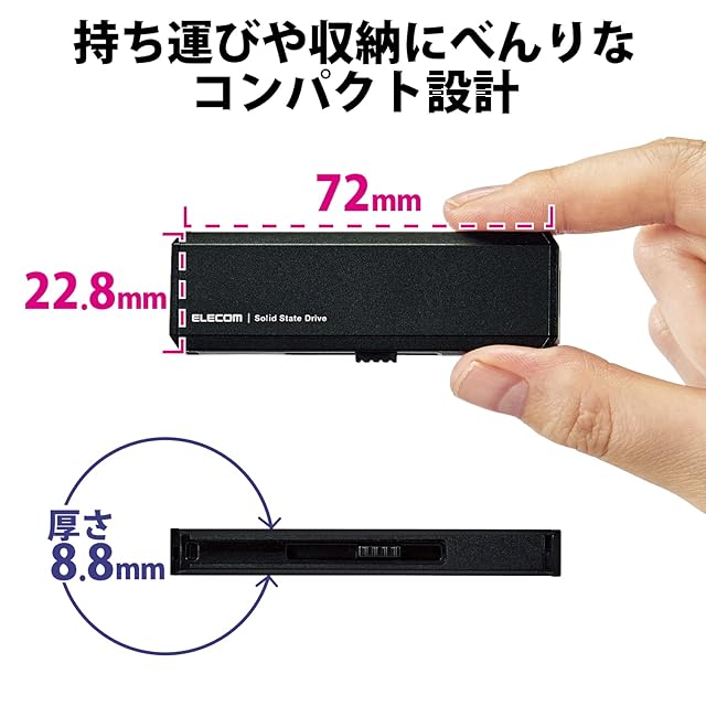 読み込み600MB/s、書き込み400MB/sの高速データ転送を実現するUSB3.2(Gen2)対応外付けポータブルSSDです。