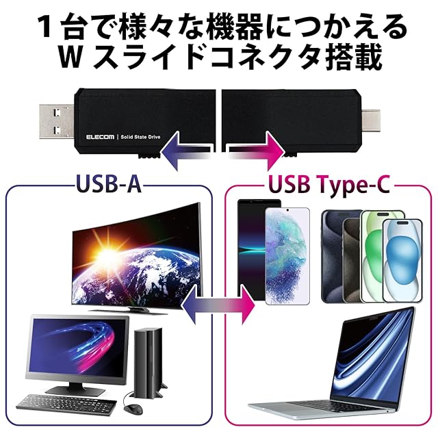 USB-Aコネクターに加え、USB Type-C(TM)コネクターが一体になっており、スライド操作でUSB-AとUSB Type-C(TM)を切り替えられます。