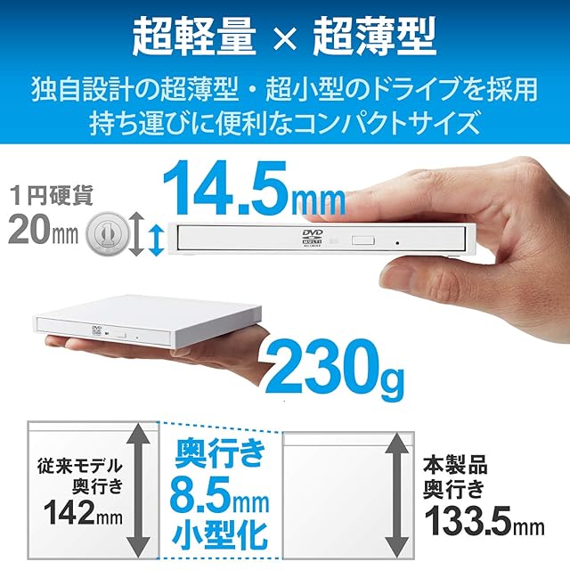 国内最軽量、最小クラスのコンパクト設計のUSB3.2(Gen1)ポータブルDVDドライブ。
