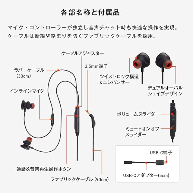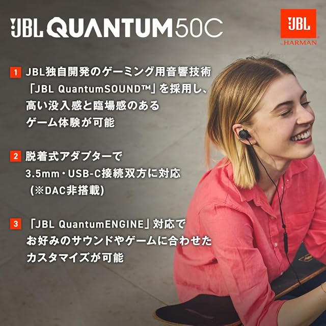 商品名:JBL QUANTUM 50C ゲーミングイヤホン/ヘッドセット/3.5MMプラグ USB Type-C 接続 脱着式アダプター/ボイスフォーカスインラインマイク/ブラック/JBLQTUM50CBLK