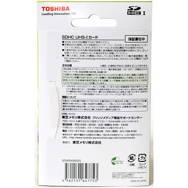 商品名:TOSHIBA SDHCカード 32GB Class10 UHS-I対応 (最大転送速度40MB/s) SDAR40N32G