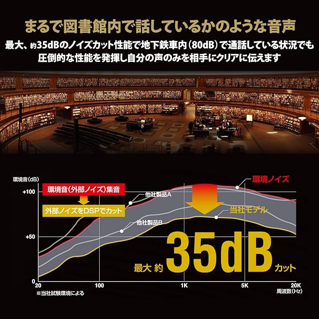 最大-35dBのノイズカット性能で、地下鉄車内(80dB)で通話している状況でも、相手には静寂な図書館内で会話しているように聞こえる圧倒的なノイズカット性能を発揮。