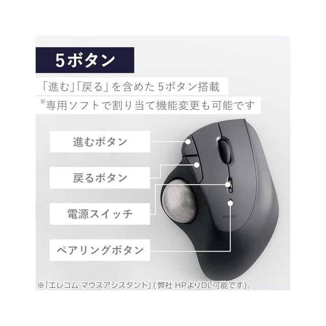 Webブラウザやフォルダの操作時に便利な「進む」、「戻る」ボタンを含めた5ボタンを搭載しています。ボタンの機能割り当ては、無料でダウンロードできる「エレコム マウスアシスタント」を利用して変更可能です。