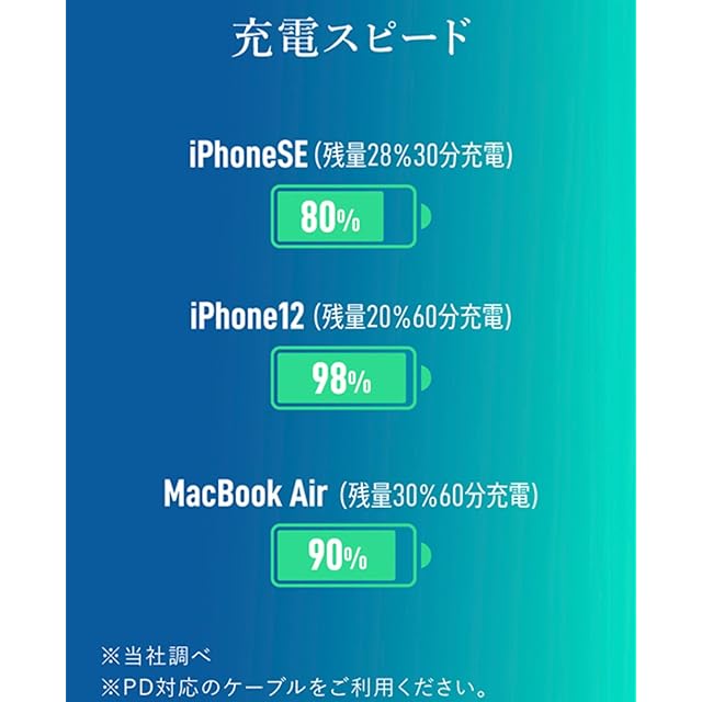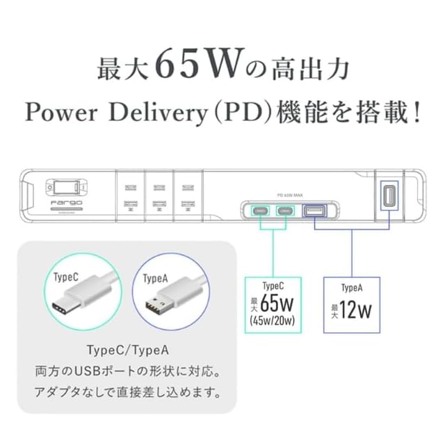✅【PD65W Type-C搭載】ノートPCも充電可能となったPower Delivery搭載のType-Cポートが2口。Type-Aポートの出力は最大12W。