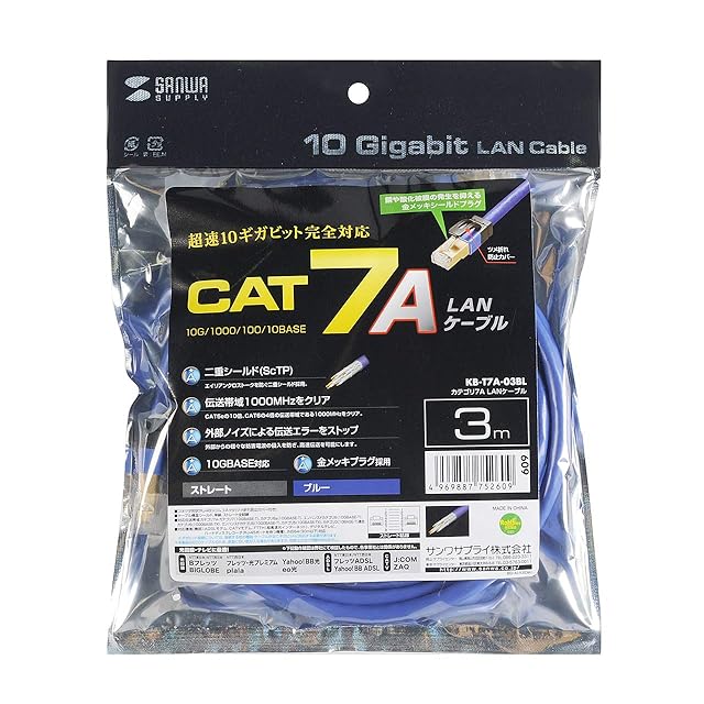 商品名:サンワサプライ CAT7A LANケーブル (3m) 10Gbps/1000MHz RJ45 ツメ折れ防止 ブルー KB-T7A-03BL