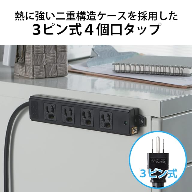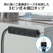 差し込み口は耐熱性に優れたユリア樹脂と二重構造設計を採用した3ピン式4個口のタップです。