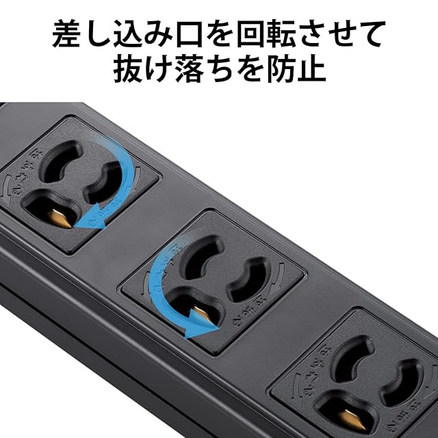 差し込み口を回転させることによりプラグをロックすることができ、不意の抜け落ちを防止します。