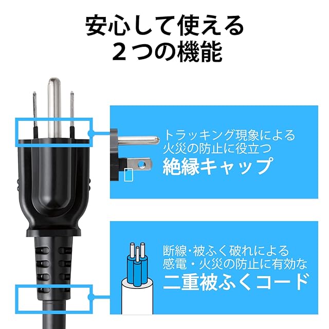 プラグのN極とL極の根本には絶縁キャップを搭載し、トラッキング現象による火災の防止に役立ちます。