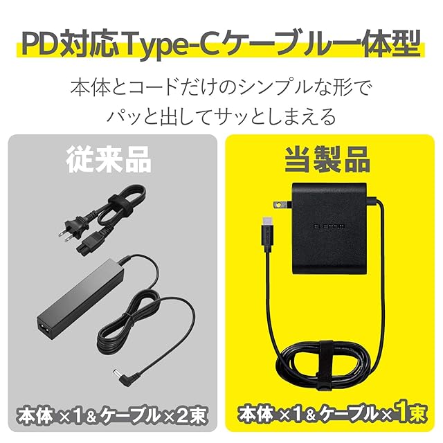 商品名:エレコム ノートPC用ACアダプター Type-C PD対応 65W ケーブル一体型 2m ブラック ACDC-PD0465BK 【 iPhone16 対応】