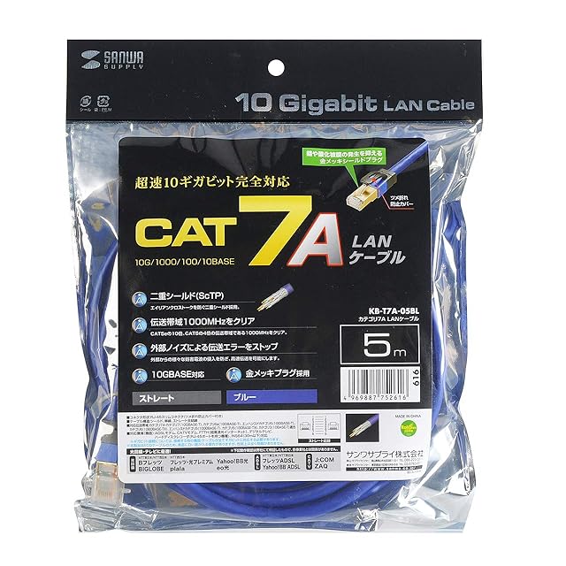商品名:サンワサプライ CAT7A LANケーブル (5m) 10Gbps/1000MHz RJ45 ツメ折れ防止 ブルー KB-T7A-05BL