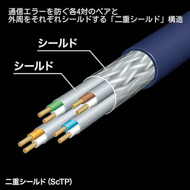 通信エラーを防ぐ各4対のペアと外周をそれぞれシールドする「二重シールド」構造。