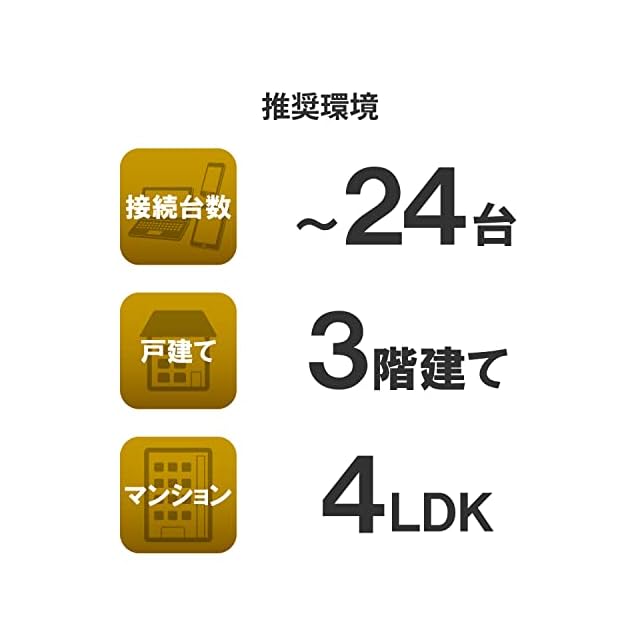 【推奨利用環境】戸建て3階建て、マンション4LDK、接続台数24台。実際の利用環境によって、電波状況は変化します。参考程度にご利用ください。