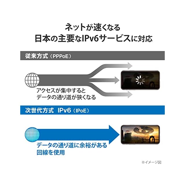 回線が混雑しにくいIPv6 IPoEインターネット接続に対応し、快適な通信が可能です。また、IPv6 IPoEインターネット接続であれば、インターネットポートにLANケーブルを接続するだけですぐにインタ―ネットが使えます。