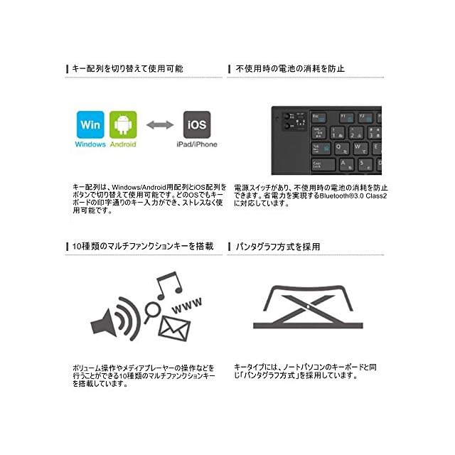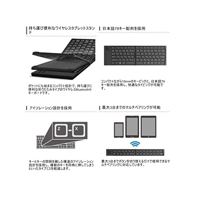 ポケットにも収まるコンパクト設計で、持ち運びに便利な折りたたみタイプのワイヤレスBluetooth(R)キーボードです。