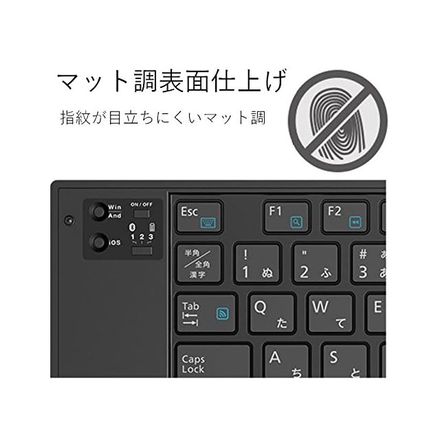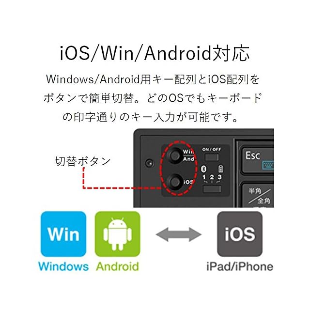 キー配列は、Windows/Android用配列とiOS配列をボタンで切り替えて使用可能です。どのOSでもキーボードの印字通りのキー入力ができ、ストレスなく使用可能です。