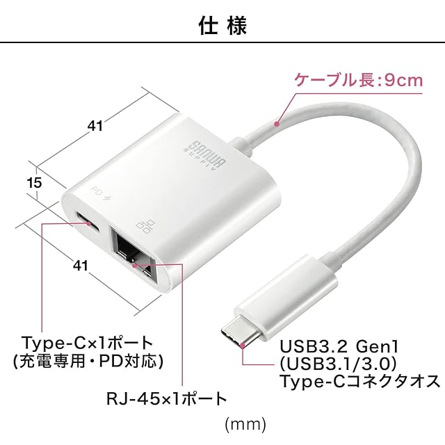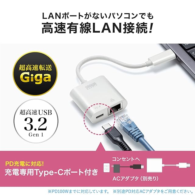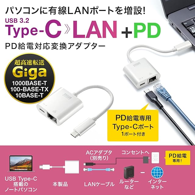 商品名:サンワサプライ USB TypeC-LAN変換アダプタ(PD対応) USB3.2 Gen1-RJ-45 ホワイト USB-CVLAN7W