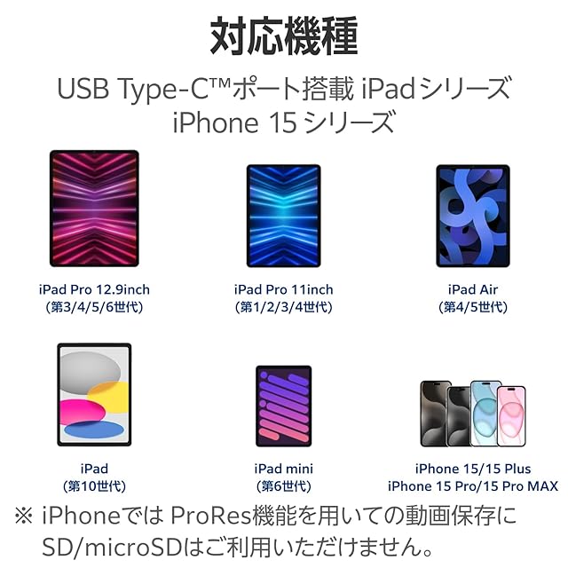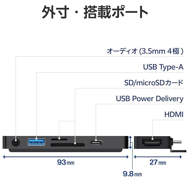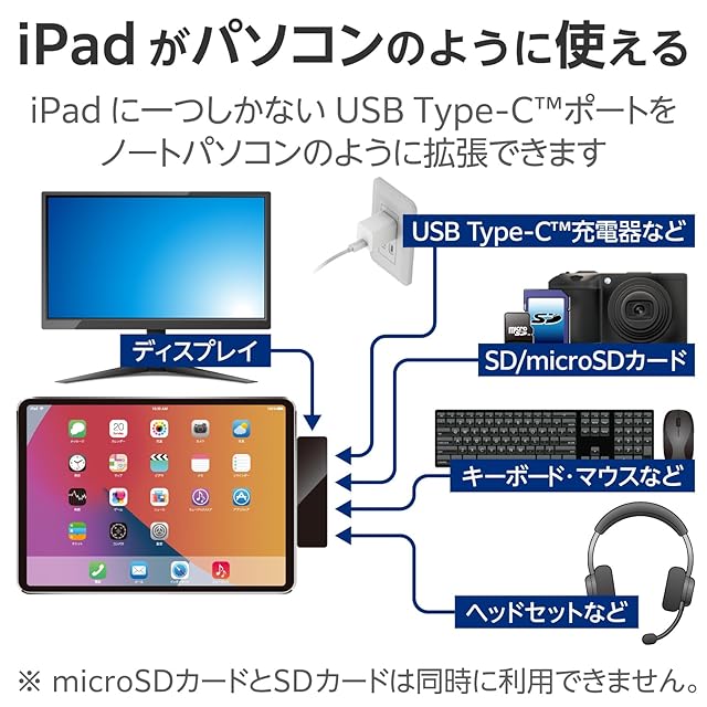 4K60Hz 映像出力を含む多彩なインターフェイスを搭載しています。HDMI 出力、USB TypeA、USB TypeC(PD 対応)、SD/microSD スロット、イヤホン(ヘッドセット)3.5mmジャックを装備しています。また、PowerDelivery 規格に対応しているため、iPad に給電しながら長時間作業を行うことができます。