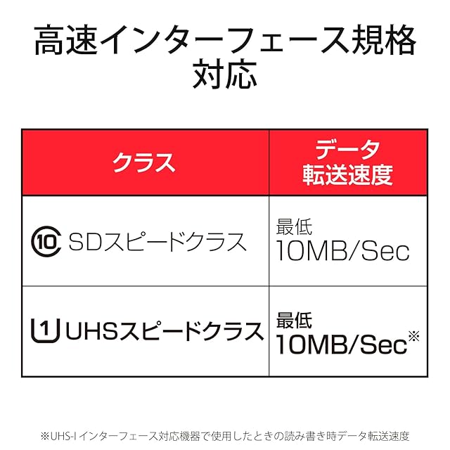 高速インターフェース規格であるUHS-I/UHSスピードクラスの「Class1」、および読み書き時の最低速度をするSDスピードクラスの「Class10」に対応しています。