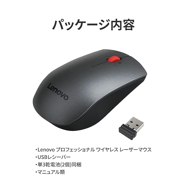 梱包物:Lenovo プロフェッショナル ワイヤレス レーザーマウス、USBレシーバー、単3乾電池(2個)同梱、マニュアル類