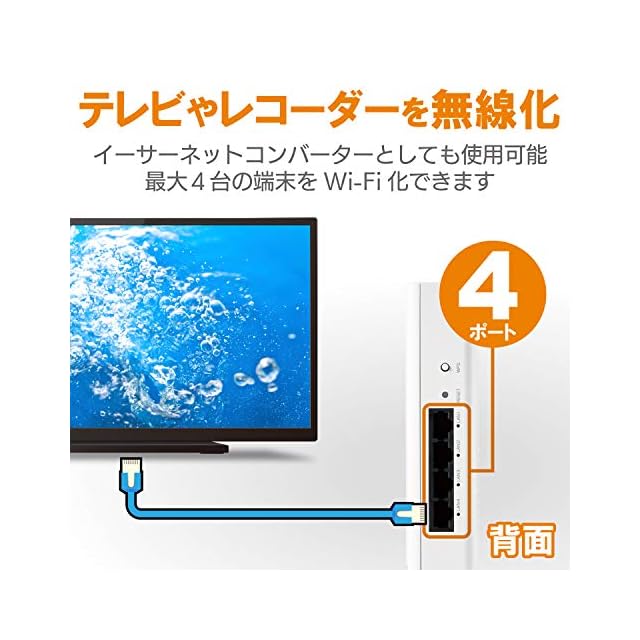 [特徴2]イーサネットコンバーターとして利用することで、TV、レコーダー、ゲーム機など、最大4台までWi-Fi化が可能。