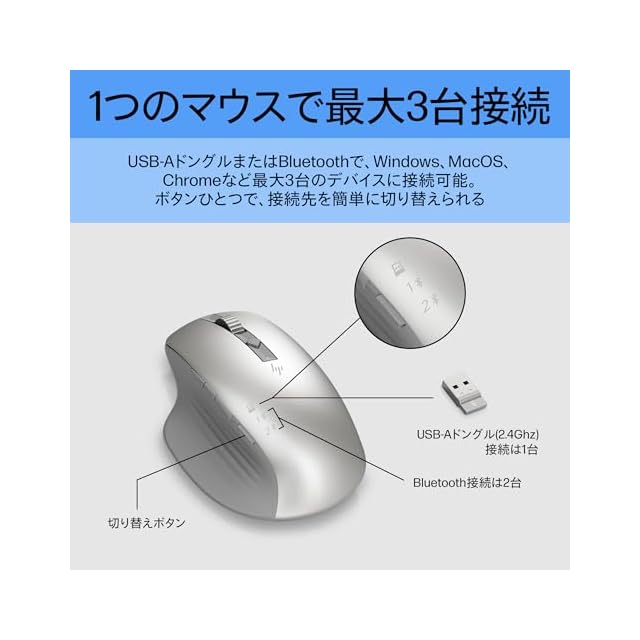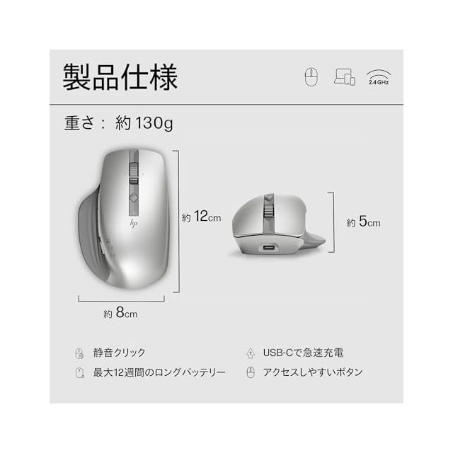商品名:HP 930 ワイヤレス クリエイター マウス Bluetooth または USB ドングル経由で接続 マルチ OS 7 プログラムボタン 人間工学に基づいたグリップ 静音 超高速スクロール 3000dpi ガラス面読み取り対応センサー USB-C充電式 電池もち3か月