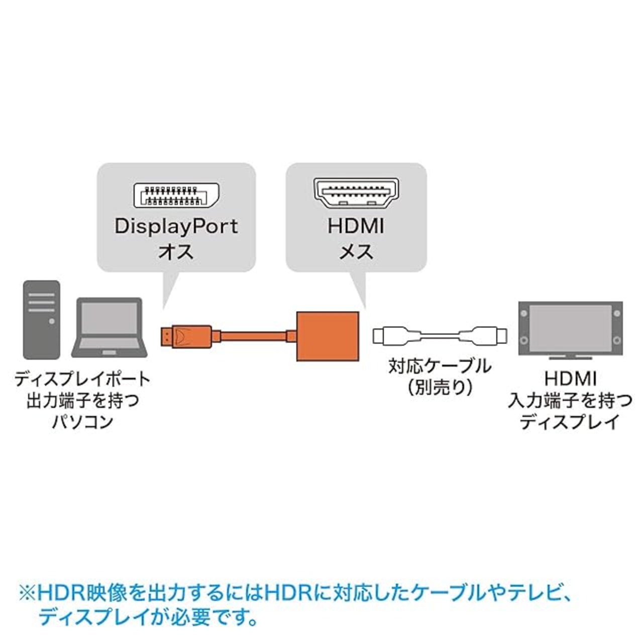 DisplayPortポートからHDMI入力のテレビやディスプレイに出力するための変換アダプタ。HDR対応。