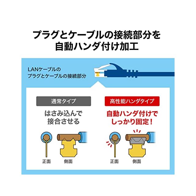 コネクタ内のハンダ加工により抵抗値の安定性を実現した、耐振動性、耐引張強度、耐経年変化に優れ、しかも耐ノイズ性にも優れた産業用途の高性能カテゴリ6A LANケーブルです。