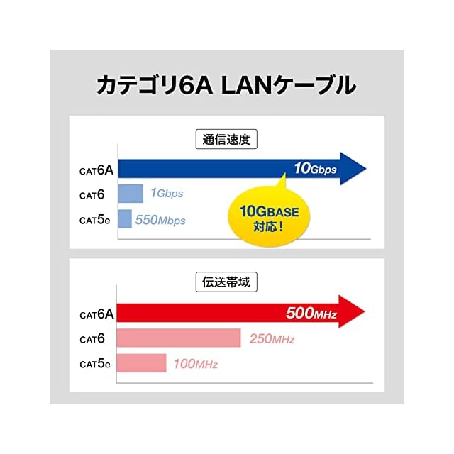 カテゴリ5eの5.0倍、カテゴリ6の2倍の伝送帯域である500MHzをクリアします。帯域が広いほど高速伝送が可能になり、データエラー防止効果があります。