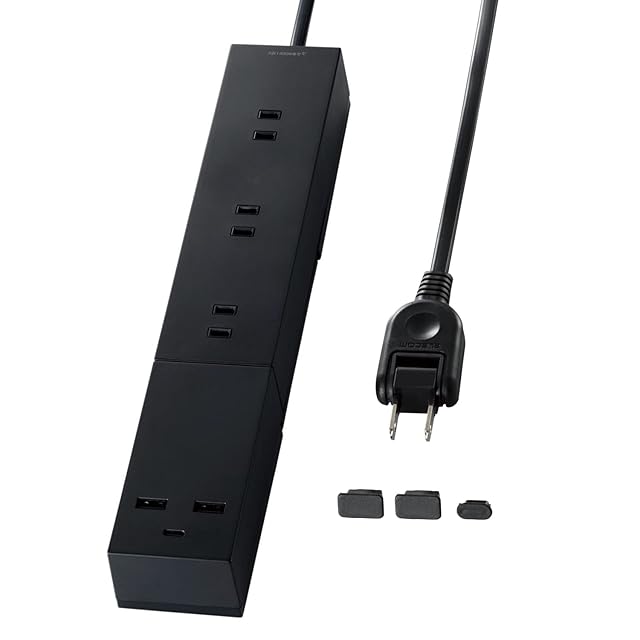 エレコム 電源タップ USBタップ 2m [ USB-C 1ポート / USB-A 2ポート / コンセント3口 ] 倒れにくく吊り下げ可能な脚パーツ付き USBポート用キャップ付き ブラック T-U03-3320BK | LIS MART