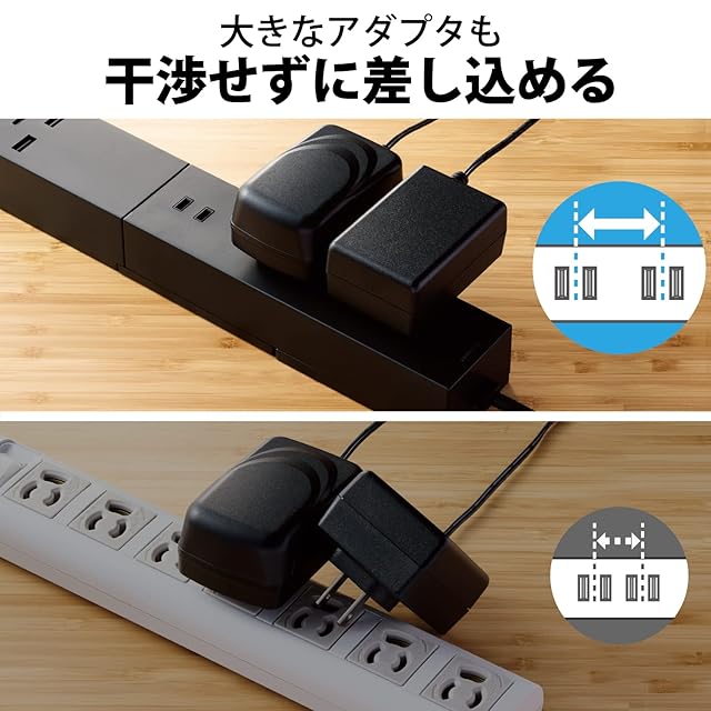 AC差込口の間隔距離を57mmとすることで、大きなACアダプターなどを利用する際も隣のAC差込口に干渉しにくい設計となっています。