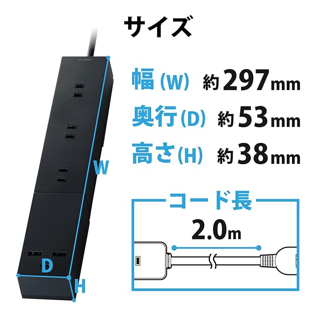 商品名:エレコム 電源タップ USBタップ 2m [ USB-C 1ポート / USB-A 2ポート / コンセント3口 ] 倒れにくく吊り下げ可能な脚パーツ付き USBポート用キャップ付き ブラック T-U03-3320BK
