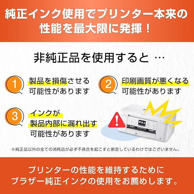 ブラザー純正インクは製品本体の性能を十分に発揮するために研究を重ね、開発されています。非純正インクをお使いになりますと製品本体の性能を十分に発揮できないだけでなく製品本体を損傷させる可能性がありますのでご注意ください。