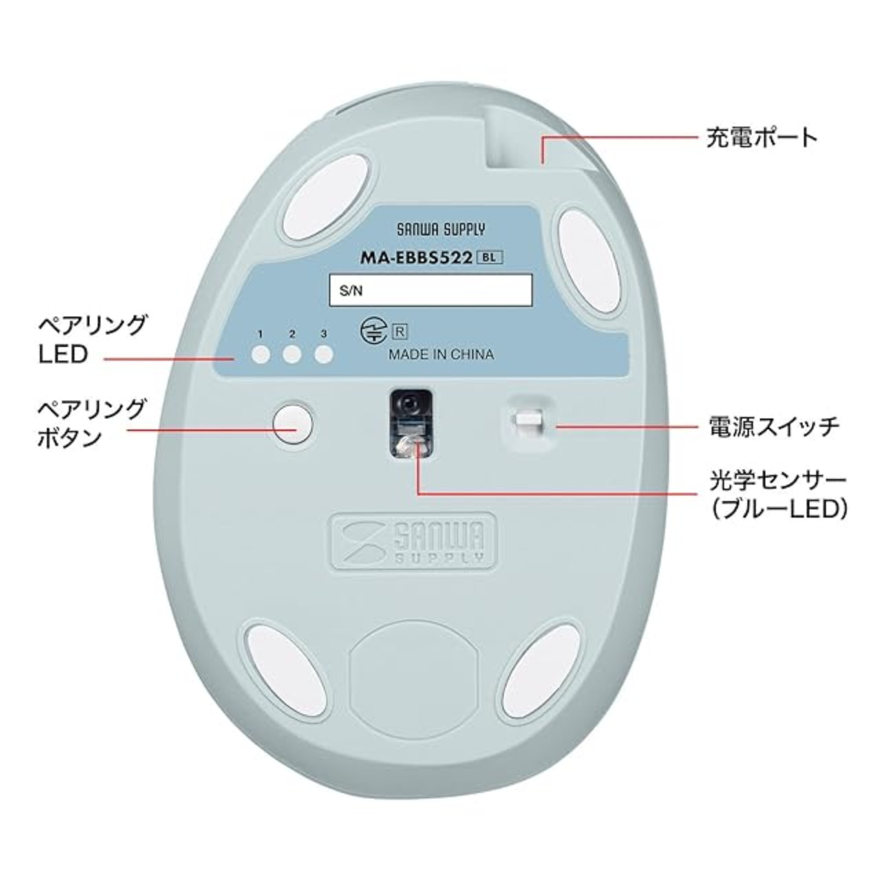 商品名:サンワサプライ 静音Bluetooth小型エルゴノミクスマウス(充電式・5ボタン・ブルー) MA-EBBS522BL