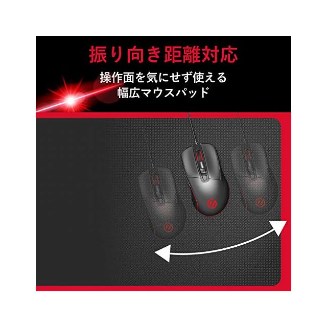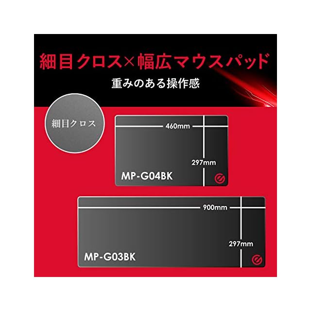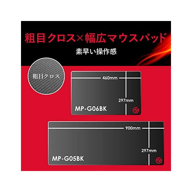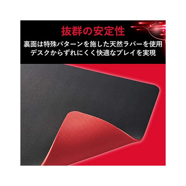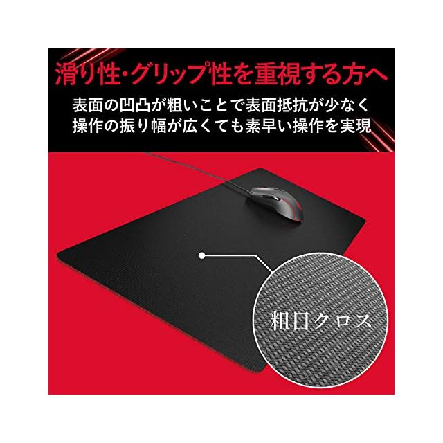表面の凹凸が粗い粗目クロスを採用し、表面抵抗が少なく、操作の振り幅が広くても素早いマウス操作を実現するゲーミングマウスパッドです。