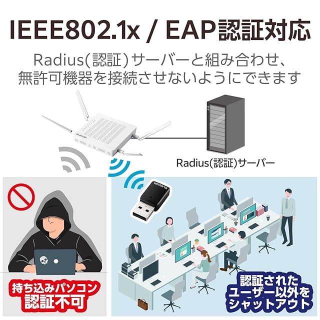 RADIUSサーバーと組み合わせることでアクセスを許可されたユーザーのみがネットワークに接続できるWPA2-EAPやIEEE802.1X/EAP認証に対応し、高度にセキュリティ保護されたネットワーク環境を構築できます。