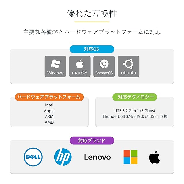幅広い互換性:Windows 7以降、Linux LTS Kernel 4.19以降、MacOS、iOS、ChromeOSなど、主要なOSに対応し、自動インストールが可能。MacBook、Chromebook、Intel、AMD、ARM(Snapdragon)、Apple Siliconなど、あらゆるハードウェアプラットフォームで利用可能